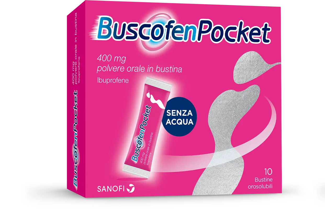 BUSCOFENPOCKET viene usato per il trattamento sintomatico di breve durata di dolori di intensità lieve-moderata come mal di testa, mal di denti, dolori mestruali e/o febbre.